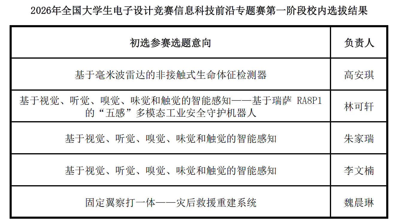 根据《关于组织参加2026年全国大学生电子设计竞赛信息科技前沿专题赛的通知》要求及相关安排,学校于12月30日组织完成第一阶段校内选拔。经专家评议,决定推荐《基于毫米波雷达的非接触式生命体征检测器》等共5支项目团队参加第二阶段校内选拔。
