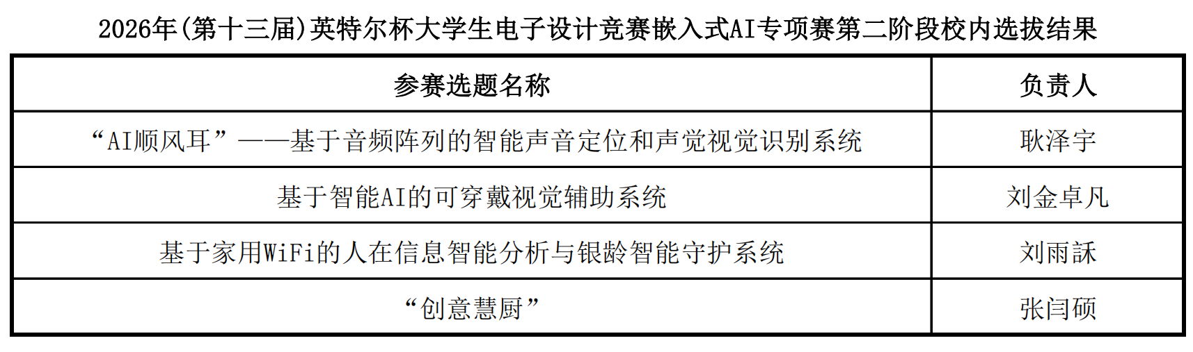 根据《关于组织参加2026年(第十三届)英特尔杯大学生电子设计竞赛嵌入式AI专题赛的通知》要求及相关安排,学校于3月17日组织完成第二阶段校内选拔。经专家评议,决定推荐《“AI顺风耳”——基于音频阵列的智能声音定位和声觉视觉识别系统》等共4支项目团队参加全国分区初选。